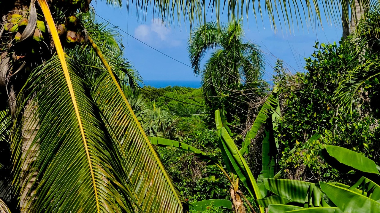 - Lush tropical landscaping featuring coconut palms, banana plants, passion fruit vines, carambola, cacao, acerola, avocado, and citrus varieties